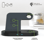 Estación de carga Inalámbrica 3 en 1 libre de cables, dos pads para cargar cualquier dispositivo con carga inalámbrica Qi y un espacio adicional para cargar un Apple Watch. Funciona perfectamente con estuches de hasta 3mm y además tiene una salida posterior USB-C y otra USB-A para cargar otros dispositivos.